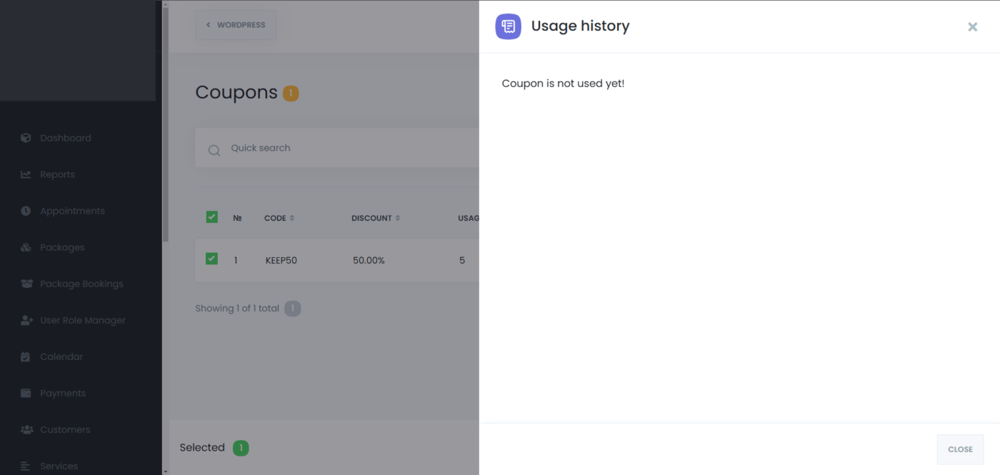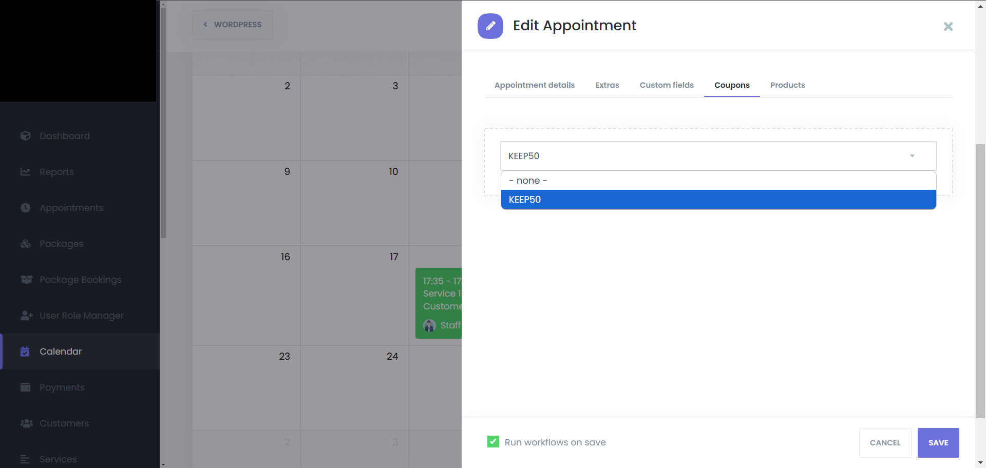 After that, go to the “Coupons” tab, and select the coupon that you want to use for that appointment, and click on save: