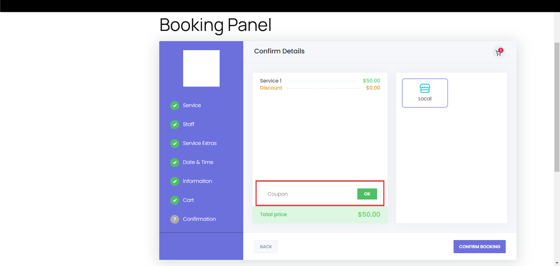 - Go to the booking panel, continue with the steps, reach the Confirmation step