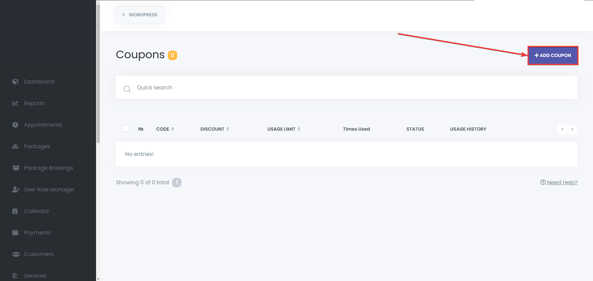 If there’s an appointment that should not have the coupon discount, but there is already a coupon added to that appointment, you can remove the coupon easily. To do so, you should go to the Appointments menu, or the Calendar module, find the appointment that you’re looking for, edit it, go to the “Coupons” tab, and select the “- none -” option: