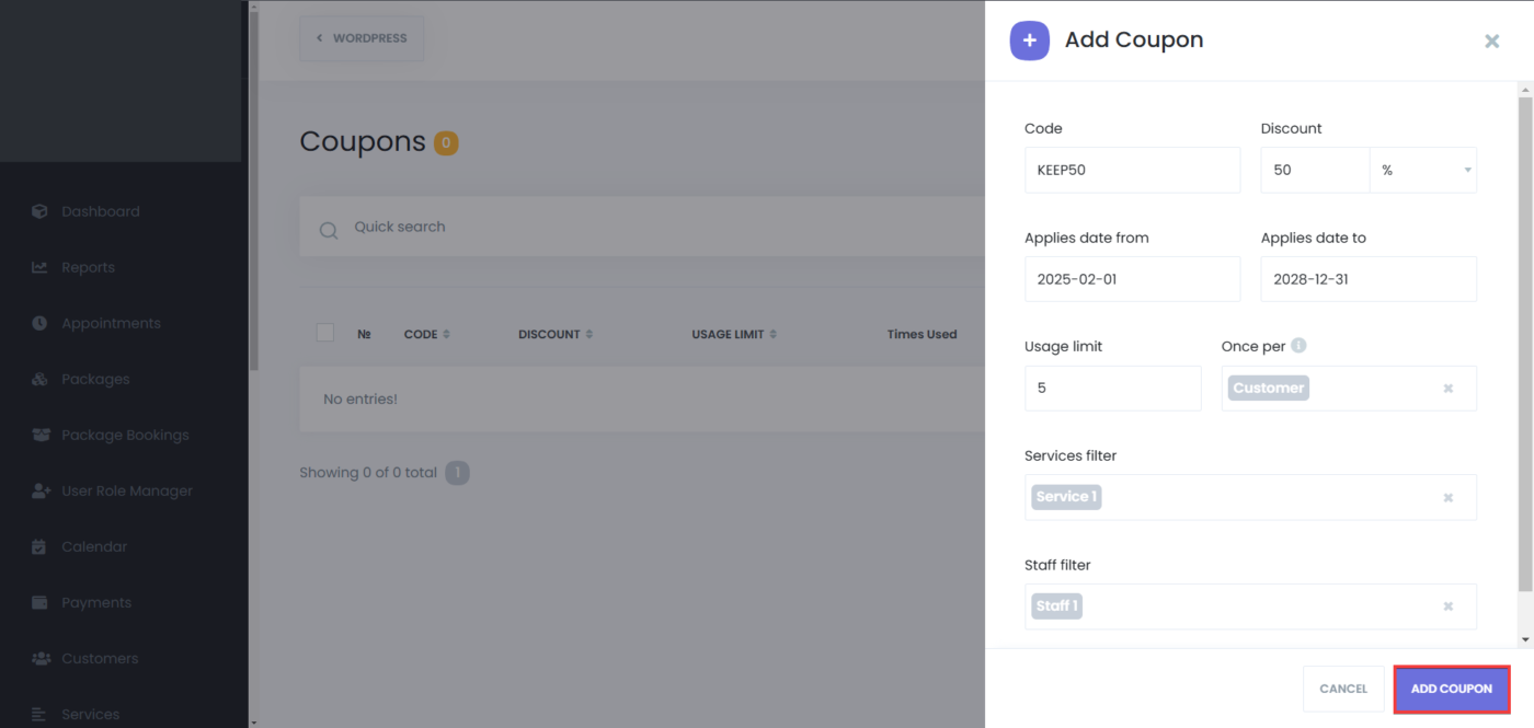 - Services Filter: Select specific services to which the coupon applies. Leave empty to allow the coupon for all services.