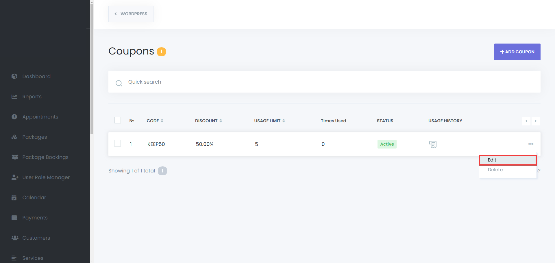 - In the coupons list, click the options icon (three dots) next to the desired coupon.